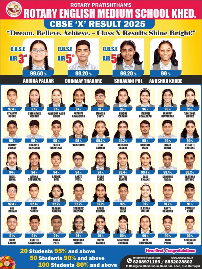 खेड – ( प्रतिनिधी ) : शैक्षणिक वर्ष सन 2024-25 मधील सी. बी. एस. ई. इ. 10 वी बोर्ड परीक्षेत रोटरी इंग्लिश मिडिअम स्कूल खेडच्या विद्यार्थ्यांनी 100 टक्के निकालाची परंपरा कायम राखत दैदिप्यमान सुयश प्राप्त केले.