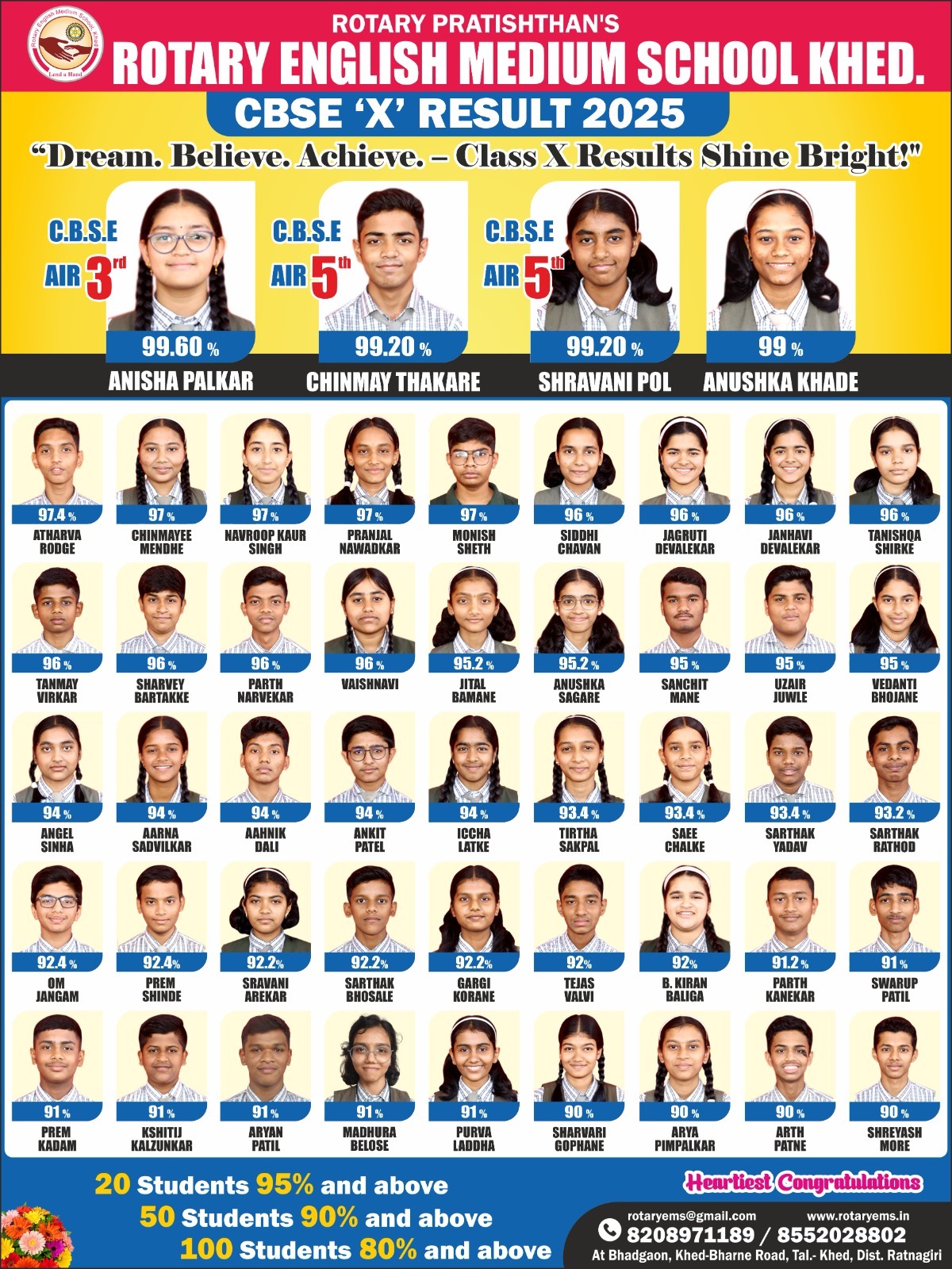 95 टक्क्यांपेक्षा अधिक गुण प्राप्त केलेल्या एकूण 22 विद्यार्थ्यांमध्ये कु. अनिषा पालकर (99.60 %), कु. श्रावणी पोळ (99.20 %), कु. चिन्मय ठाकरे (99.20 %), कु. अनुष्का खाडे (98.60 %), कु. अथर्व रोडगे (97.40 %), कु. चिन्मयी मेंढे (97 %), कु. नवरूप सिंग (96.80ः), कु. प्रांजल नावाडकर (96.60 %), कु. मोनिश शेठ (96.60 %), कु. सिध्दी चव्हाण (96ः), कु. जागृती देवळेकर (96 %), कु. जान्हवी देवळेकर (96 %), कु. तनिष्का शिर्के (96 %), कु. तन्मय वीरकर (95.80 %), कु. शार्वेय बारटक्के (95.60 %), कु. पार्थ नार्वेकर (95.60 %), कु. वैष्णवी (95.60 %), कु. जितल बामणे (95.20 %), कु. अनुष्का सगरे (95.20 %), कु. संचित माने (95 %), कु. उझैर जुवळे (94.80 %) व कु. वेदांती भोजने (94.80 %) या गुणवंत विद्यार्थ्यांचा समावेश आहे.