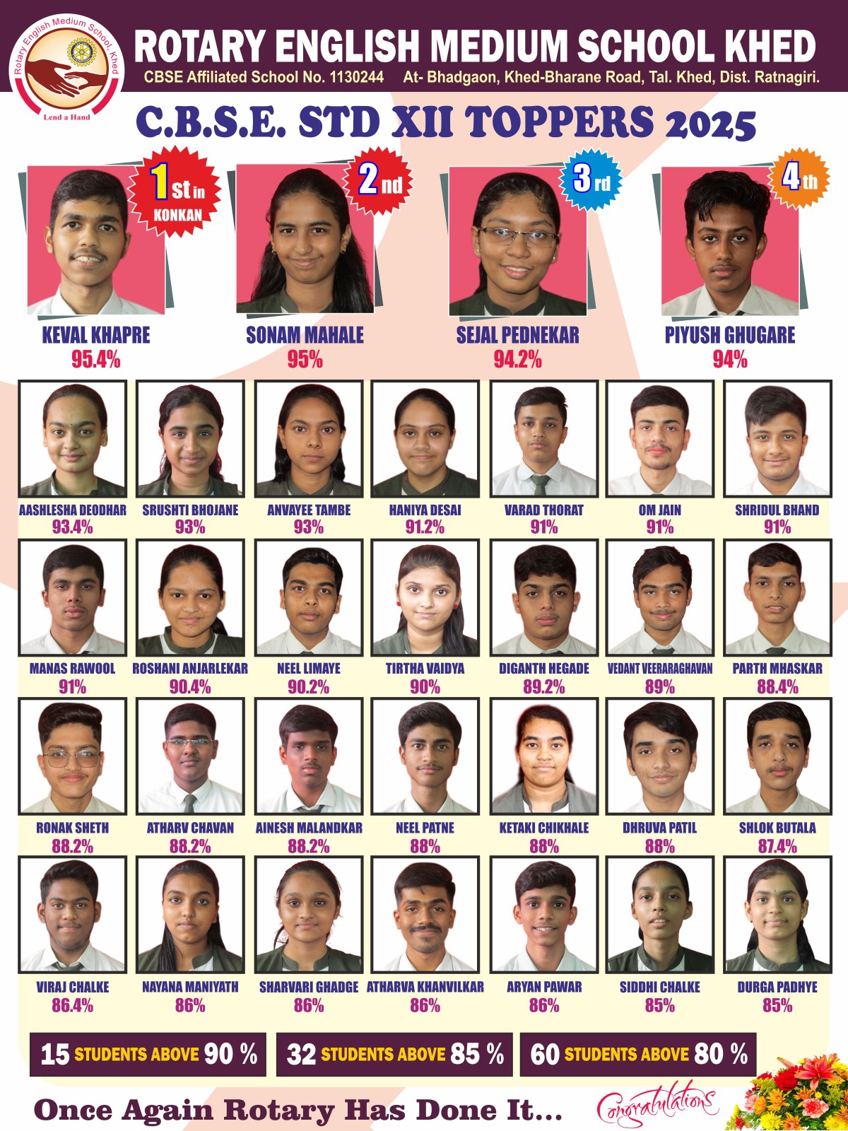 खेड : शैक्षणिक वर्ष 2024-25 मधील सी. बी. एस. ई. इयत्ता 12 वी बोर्डाच्या विज्ञान शाखेचा निकाल जाहीर झाला. यामध्ये रोटरी इंग्लिश मिडिअम स्कूल खेडच्या विद्यार्थ्यांनी विशेष प्राविण्यासह आपल्या शाळेच्या निकालाची परंपरा कायम राखली आहे.