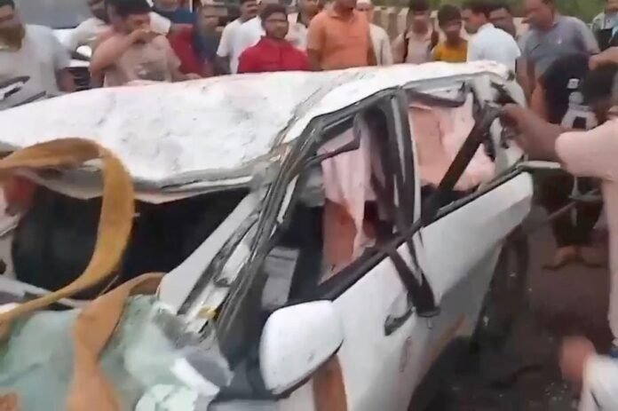 खेड : मुंबई-गोवा राष्ट्रीय महामार्गावर भरणा नाका येथे जगबुडी नदीच्या पुलावरुन कार सुमारे १०० फूट खोल कोसळून अपघातात पाच जणांचा मृत्यू झाला आहे. मुंबईहून देवरुख येथे अंत्यविधीसाठी जात असताना हा अपघात झाला. या घटनेत कारचालक गंभीर जखमी झाला आहे. तर, पाच जणांचा जागीच मृत्यू झाला आहे.