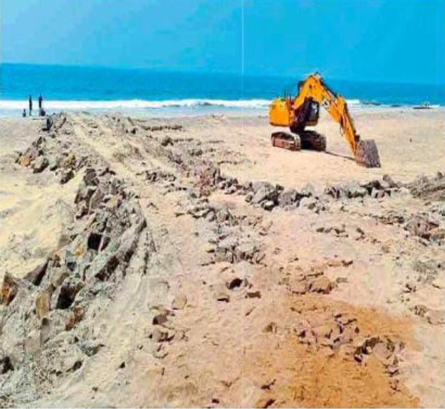 पूर्वीच्या संरक्षक बंधाऱ्याचे काळे दगड वापरून काम सुरू