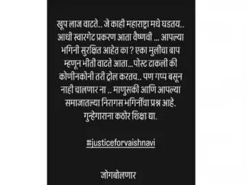 अभिनेता, निर्माता पुष्कर जोगने (Pushkar Jog) सोशल मीडियावर त्याचा संताप व्यक्त केला आहे. तो लिहितो, “खूप लाज वाटते…जे काही महाराष्ट्रात घडतंय…आधी स्वारगेट प्रकरण आता वैष्णवी…आपल्या भगिनी सुरक्षित आहेत का? एका मुलीचा बाप म्हणून भीती वाटते आता…पोस्ट टाकली की कोणी ना कोणी तरी ट्रोल करतंच…पण गप्प बसून नाही चालणार ना…माणुसकी आणि आपल्या समाजातल्या निरागस भगिनींचा प्रश्न आहे. गुन्हेगारांना कठोर शिक्षा द्या. वैष्णवीला न्याय द्या. जोग बोलणार.”