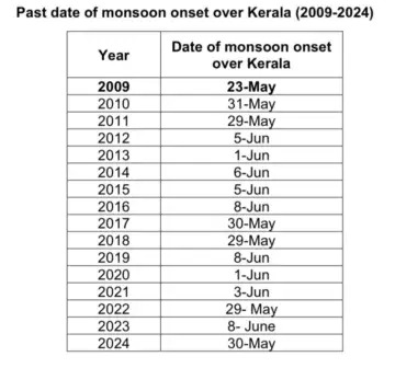 केरळ हे मान्सूनचे भारतातील प्रवेशद्वार मानले जाते. केरळात प्रवेश केल्यानंतर नैऋत्य मोसमी वारे अर्थात मान्सून देशभरात आगेकूच करतो. 2009 नंतरचे सर्वात लवकर आगमन ठरले असून 2009 साली मान्सून 23 मे रोजी केरळात दाखल झाला होता. यावर्षी त्याहीपेक्षा एक दिवस आधी म्हणजेच 24 मे रोजी मान्सूनचे आगमन झाल्याचे हवामान विभागाने जाहीर केले आहे. 1975 नंतरच्या नोंदी पाहता, केरळमध्ये मान्सूनचे आतापर्यंतचे सर्वात लवकर आगमन 1990 साली झाले होते. तेंव्हा मान्सून 19 मे रोजी केरळात दाखल झाला होता. ही तारीख नेहमीच्या मान्सून आगमनाच्या तारखेच्या 13 दिवस आधीची होती.