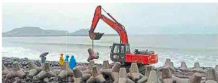 रत्नागिरी : मिऱ्या धूपप्रतिबंधक बंधाऱ्याचे १२०० मीटरचे काम पावसातही युद्धपातळीवर सुरू आहे. पालकमंत्री उदय सामंत यांनी बंधारा ४० फूट आत समुद्रात घेतला. यावर साडेतीन कोटी रुपये खर्च करून पर्यटनासाठी हा बंधारा उपलब्ध करण्यात येणार आहे. बंधाऱ्याचे काम झाल्यामुळे उधाणाला किनाऱ्यावर येऊन आदळणाऱ्या अजस्त्र ३ ते ४ मीटरच्या लाटांची तीव्रता मात्र कमी झाली आहे.