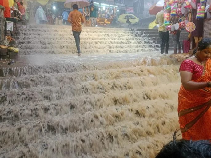 सोमवारी (दि.२६) सकाळच्या सुमारास पावसाने उसंत घेतली होती सूर्यदर्शन झाले होते. मात्र हे वातावरण काही काळ टिकले, त्यानंतर दुपारी १ वाजता जोरदार पावसाला सुरुवात झाली. ढगफुटीसारखा पाऊस कोसळला. सलग अर्धा ते पाऊणतास झालेल्या पावसाने नाले व बंधारे भरले आहेत. जेजुरी गडाच्या पायरीमार्गावरून धो धो पाणी वाहत असल्याने भाविकांची मोठी तारांबळ उडाली होती. तर अनेकांच्या घरात ही पाणी शिरले. मोरगाव रस्त्यालगतच्या घरातून पाणी घुसल्याने नागरिकांची मोठी धावपळ उडाली. नगरपालिकेने ताबडतोब उपाययोजना कराव्यात अशी स्थानिकांनी मागणी केली आहे.