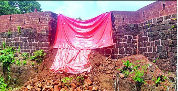 नाटे : राजापूर तालुक्यातील साखरी नाटे ग्रा. पं. हद्दीतील घेरा यशवंतगडच्या डागडुजीचे काम सुरू असताना पावसाच्या पहिल्याच सरीमुळे हे बांधकाम ढासळले आहे. बांधकामासाठी वापरण्यात येणारा जांभा दगडही निकृष्ट दर्जाचा वापरण्यात येत असल्याचा आरोप ग्रामस्थांकडून केला जात आहे.