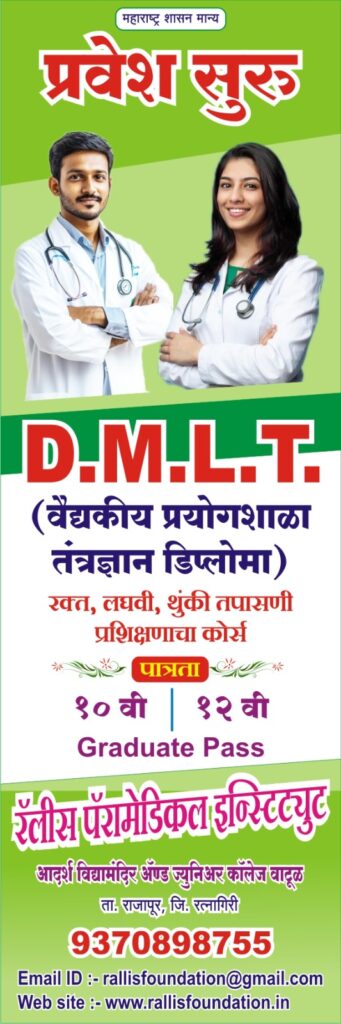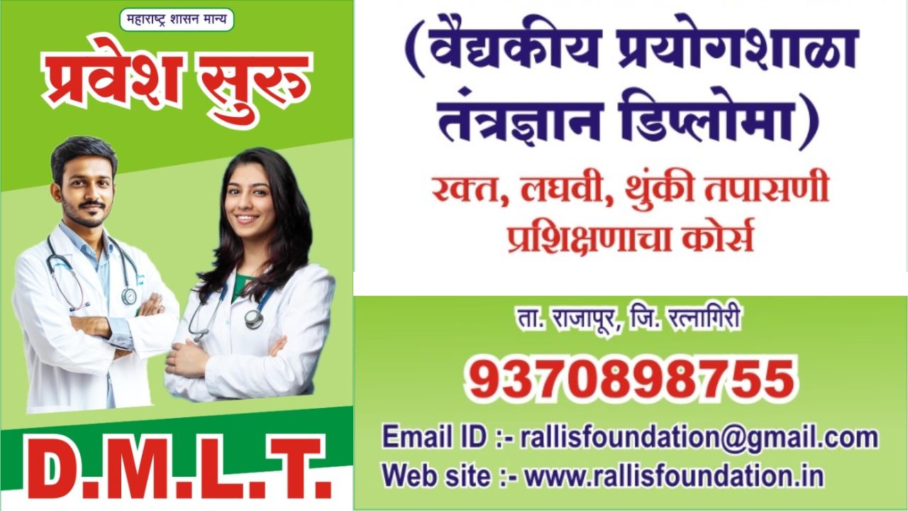 रत्नागिरी, (राजापूर): नुकतेच दहावी आणि बारावीचे निकाल लागल्यामुळे विद्यार्थ्यांसमोर आता पुढील शिक्षणाचा मोठा प्रश्न उभा राहिला आहे. नेमका कोणता अभ्यासक्रम निवडावा, करिअरसाठी काय उपयुक्त ठरेल, असे अनेक प्रश्न विद्यार्थी आणि पालकांना सतावत आहेत. अशा स्थितीत रत्नागिरी जिल्ह्यातील वाटूळ (तालुका राजापूर) येथील रॅलिस पॅरामेडिकल इन्स्टिट्यूटमध्ये महाराष्ट्र शासन मान्य DMLT (डिप्लोमा इन मेडिकल लॅबोरेटरी टेक्नॉलॉजी) अभ्यासक्रमासाठी प्रवेश प्रक्रिया २०२५-२६ सुरू झाली असून, हा कोर्स विद्यार्थ्यांसाठी एक उत्तम पर्याय ठरत आहे.