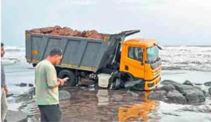 समुद्राला भरती ओहोटी सुरूच असते. समुद्र खवळलेला असतो. अशा परिस्थितीत या वाळूवरून मोठ्या डंपर ची वाहतूक करणे धोकादायक आहे. बुधवारी (ता. ४) सायंकाळी आणि दगड घेऊन जात होता. हा डंपर भरधाव वेगात होता. त्यावेळी समुद्राला भरती देखील होती. यावेळी हा डंपर खडकावर आदळून त्याचठिकाणी वाळूत रुतला आणि जोरदार खडकावर आदळल्याने टायर फुटला पुढच्या भागाचे खूप नुकसान झाले. वाळूत रुतलेला डंपर रात्री उशिरा क्रेन व दोन जेसीबीच्या साह्याने काढण्यात आला. एवढी मोठी घटना घडून देखील अजूनही त्याच मागें जेटीवर डंपरची वाहतूक सुरूच आहे.