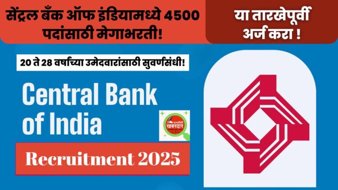 सरकारी बँकेत नोकरी मिळवण्याचे स्वप्न पाहणाऱ्या तरुणांसाठी एक आनंदाची बातमी आहे! सेंट्रल बँक ऑफ इंडियाने (Central Bank of India) अप्रेंटिस पदांसाठी (Apprentice Posts) तब्बल ४,५०० जागांची मेगाभरती जाहीर केली आहे. पात्र आणि इच्छुक उमेदवारांसाठी अर्ज प्रक्रिया सुरू झाली असून, बँक करिअर करू इच्छिणाऱ्या पदवीधर उमेदवारांसाठी ही एक उत्तम संधी आहे.