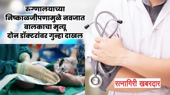 राजापूर : राजापूर तालुक्यातून एक धक्कादायक घटना समोर आली आहे. डॉक्टरांच्या कथित निष्काळजीपणामुळे एका नवजात बालकाचा मृत्यू झाल्याप्रकरणी आणि प्रसूतीदरम्यान महिलेला झालेल्या गंभीर दुखापतीबद्दल दोन डॉक्टरांविरोधात गुन्हा दाखल करण्यात आला आहे. ही घटना ३० मार्च २०२४ रोजी पहाटे ३.३० ते १६ एप्रिल २०२४ रोजी सकाळी ८.०० च्या दरम्यान घडली.