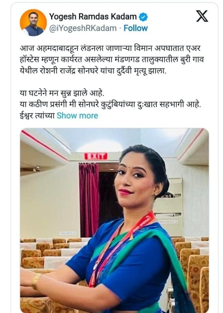 या अपघातात मंडणगड तालुक्यातील बुरी गावची रहिवासी आणि एअर हॉस्टेस म्हणून कार्यरत असलेली कुमारी रोशनी राजेंद्र सोनघरे (२७) हिचा दुर्दैवी मृत्यू झाला. रोशनी सध्या डोंबिवली येथे आपल्या कुटुंबासोबत राहत होती. रोशनीने अल्पावधीतच आपल्या कार्यकुशलतेने प्रगतीचा पल्ला गाठला होता, मात्र नियतीने तिचं स्वप्न अर्धवट राहिले.