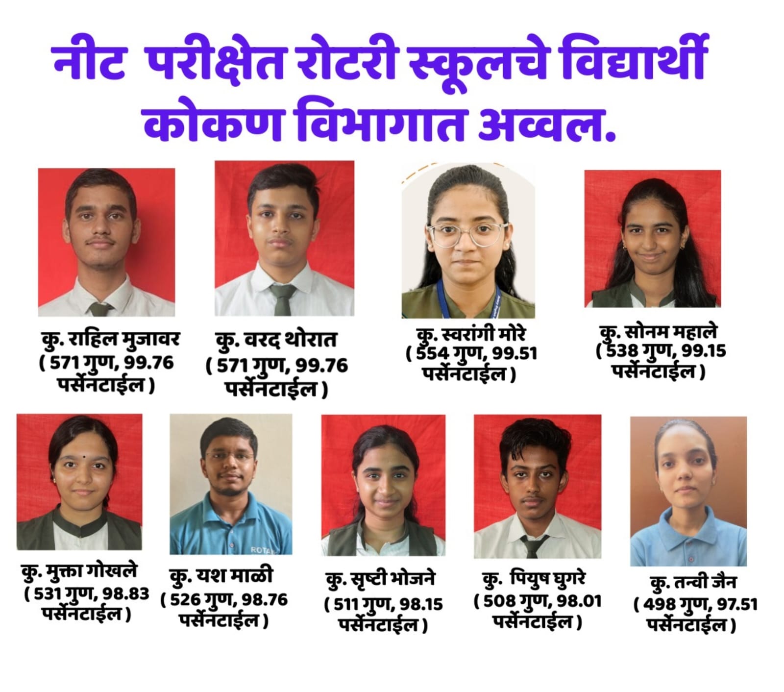 - कु. स्वरांगी मोरे: ५५४ गुण (९९.५१ पर्सेंटाईल)