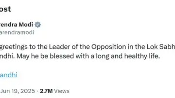 सोशल मीडिया माध्यम एक्सवर पोस्ट करत राहुल गांधी यांना शुभेच्छा दिल्या आहेत. या पोस्टमध्ये नरेंद्र मोदी यांनी लिहिले की,”लोकसभेतील विरोधी पक्षनेते राहुल गांधी यांना वाढदिवसाच्या शुभेच्छा! तुम्हाला दीर्घ आणि निरोगी आयुष्य लाभो ही सदिच्छा”.