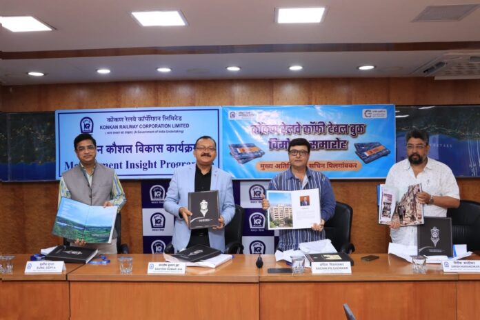 बेलापूर, २० जून २०२५: कोकण रेल्वेच्या कॉर्पोरेट कार्यालयात आज एका विशेष समारंभात ‘कोकण रेल्वे कॉफी टेबल बुक’ चे प्रकाशन करण्यात आले. प्रसिद्ध अभिनेते, दिग्दर्शक आणि चित्रपट निर्माते श्री. सचिन पिळगावकर यांच्या हस्ते या कॉफी टेबल बुकचे अनावरण झाले. यावेळी कोकण रेल्वे कॉर्पोरेशन लिमिटेडचे (KRCL) अध्यक्ष आणि व्यवस्थापकीय संचालक श्री. संतोष कुमार झा, संचालक (ऑपरेशन्स अँड कमर्शियल) श्री. सुनील गुप्ता आणि मुख्य जनसंपर्क अधिकारी श्री. गिरीश आर. करंदीकर हे उपस्थित होते. कॉर्पोरेट कार्यालयातील इतर अधिकारी आणि कर्मचारीही या प्रकाशन सोहळ्याला उपस्थित होते.