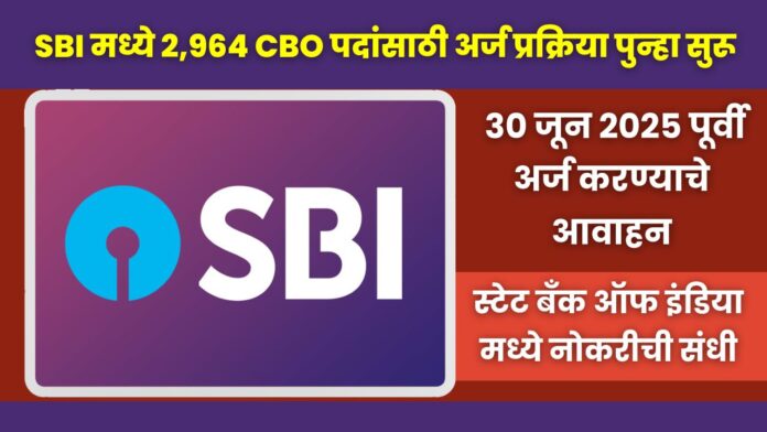 रत्नागिरी, [२३ जून, २०२५]: बँकेत करिअर करू इच्छिणाऱ्या तरुणांसाठी स्टेट बँक ऑफ इंडिया (SBI) एक सुवर्णसंधी घेऊन आली आहे. नोकरीच्या संधी कमी होत असताना, SBI ने जाहिरात क्रमांक CRPD/CBO/२०२५-२६/०३ अंतर्गत सर्कल बेस्ड ऑफिसर्स (CBO) च्या २,९६४ रिक्त जागांसाठी ऑनलाइन अर्ज प्रक्रिया पुन्हा सुरू केली आहे.