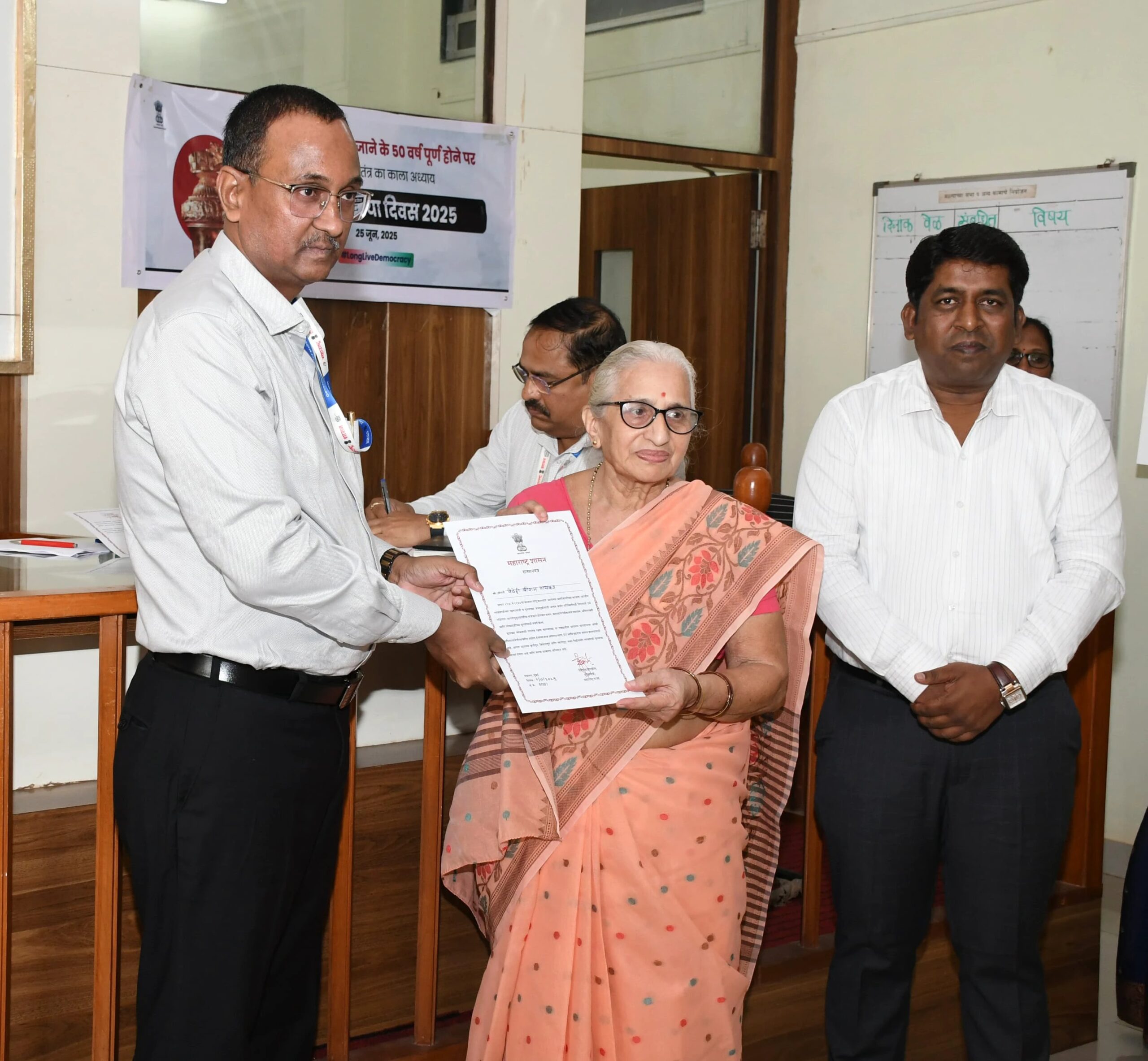 रत्नागिरी : 1975 ते 1977 या आणीबाणी कालावधीत लोकशाहीकरिता लढा देताना मिसा व डीआयआर अंतर्गत सामाजिक व राजनैतिक कारणासाठी कारावास भोगलेल्या व्यक्तींना तसेच त्यांच्या कुटुंबीयांना रत्नागिरी तहसीलदार कार्यालयातर्फे सन्मानपत्र देण्यात आले.