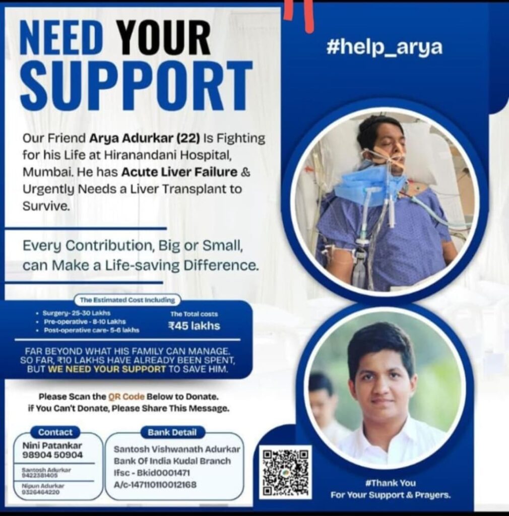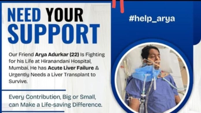 मुंबई : २२ वर्षांचा आर्या अडुरकर सध्या मुंबईतील हिरानंदानी रुग्णालयात अक्यूट लिव्हर फेल्युअर या गंभीर आजाराशी झुंज देत आहे. त्याला वाचवण्यासाठी तातडीने यकृत प्रत्यारोपणाची (Liver Transplant) गरज आहे. आर्याचे कुटुंबीय अत्यंत कठीण परिस्थितीतून जात असून, त्यांना उपचारासाठी आर्थिक मदतीची नितांत आवश्यकता आहे.
