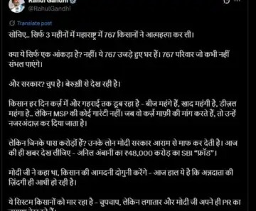 राहुल गांधींनी सोशल मीडिया पोस्टद्वारे सरकारवर निशाणा साधताना म्हटले की, ‘अवघ्या तीन महिन्यांत ७६७ शेतकऱ्यांनी आत्महत्या केल्या आहेत. हे फक्त आकडे नाहीत, तर ७६७ शेतकऱ्यांची उद्ध्वस्त घरे आहेत. ही अशी कुटुंबे आहेत, जी कधीही सावरू शकणार नाहीत. सरकार या प्रकरणात पूर्णपणे गप्प आहे. ते फक्त उदासीनतेने पाहत आहे.’
