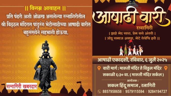 रत्नागिरी : प्रतिवर्षीप्रमाणे यावर्षी देखील सकल हिंदू समाजाच्या माध्यमातून रविवार, दिनांक ६ जुलै रोजी रत्नागिरी शहरात आषाढी वारीचे आयोजन करण्यात आले आहे. ज्या विठ्ठलभक्तांना पंढरपूरपर्यंत वारीला जाणे शक्य होत नाही, त्यांच्यासाठी विठ्ठलचरणी सेवा रुजू व्हावी या उदात्त हेतूने गेली काही वर्षांपासून ‘शक्तिमंदिर ते भक्तीमंदिर’ या संकल्पनेने या वारीचे आयोजन केले जात आहे.