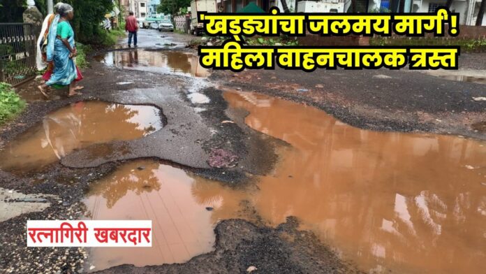 रत्नागिरी : शहरालगतच्या उद्यमनगर पटवर्धनवाडी येथील रस्त्यावर मोठमोठे खड्डे पडले असून, मुसळधार पावसामुळे या रस्त्याला आता चक्क तलावाचे स्वरूप आले आहे. वाहनचालक, विशेषतः महिलांना या रस्त्यावरून ये-जा करताना प्रचंड अडचणींचा सामना करावा लागत आहे. रत्नागिरी नगर परिषद आणि शिरगाव ग्रामपंचायत यांच्या हद्दीवरील हा महत्त्वाचा रस्ता दुरुस्त कधी होणार, असा संतप्त सवाल नागरिक उपस्थित करत आहेत.