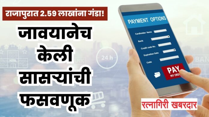 राजापूर : राजापूर तालुक्यातील ओणी (कोंडिवळे) येथे जावयानेच सासऱ्यांच्या दुकानातून मोबाईल घेऊन ऑनलाइन फसवणूक केल्याचा धक्कादायक प्रकार समोर आला आहे. दानिश हेमंत काझी (वय २९, रा. वडवली, ता. राजापूर, सध्या रा. वडाळा, मुंबई) याने फिर्यादी जायदा मुनीर काझी आणि त्यांचे पती मुनीर काझी यांच्या मोबाईलमधील फोन पे ॲपद्वारे तब्बल २,५९,०७० रुपये वेगवेगळ्या खात्यांवर पाठवून फसवणूक केली आहे.