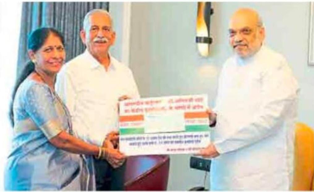 साडवली : देशसेवा करताना वीरगती प्राप्त झालेल्या तसेच जखमी झालेल्या जवानांच्या कुटुंबीयांना मदत व्हावी, या हेतूने देवरूखमधील सामाजिक भान जपणारे सामाजिक कार्यकर्ते मदन मोडक व मंजिरी मोडक या दांपत्याने केंद्रीय गृहमंत्री अमित शाह यांची भेट घेऊन ११ लाखांचा धनादेश शहा यांच्याकडे सुपूर्द केला.