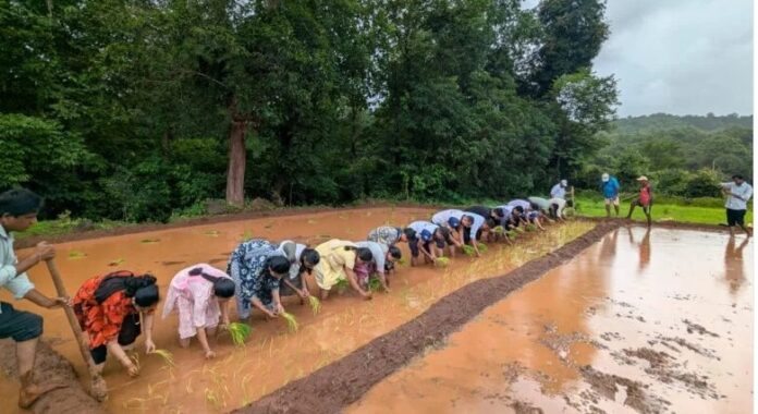 रत्नागिरी : रत्नागिरी तालुक्यातील मौजे केळ्ये येथे ‘एक दिवस बळीराजासाठी’ उपक्रमांतर्गत शेतकरी काशिनाथ बापट यांच्या प्रक्षेत्रावर चारसुत्री पद्धतीने भात पीक लागवड प्रात्यक्षिक घेण्यात आले. सीआरए तंत्रज्ञाने फळबाग लागवड प्रात्यक्षिक घेण्यात आले.