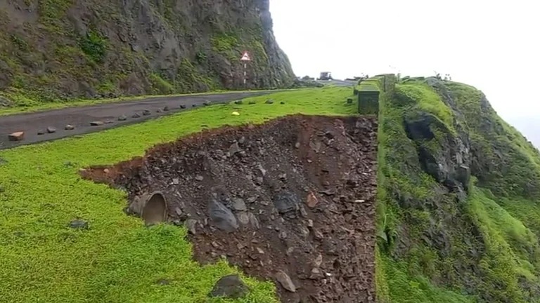 खेड : कोकणातील रत्नागिरी जिल्ह्यात खेड तालुक्यातील रघुवीर घाट ढासळू लागल्याने सुरक्षिततेचा गंभीर प्रश्न निर्माण झाला आहे. पावसाळ्यात एक आकर्षक पर्यटनस्थळ म्हणून प्रसिद्ध असलेल्या या घाटात दररोज शेकडो वाहने व हजारो पर्यटकांची वर्दळ असते. मात्र, घाटाचा रस्ता हजारो मीटर खोल दरीच्या बाजूने असलेला भाग कोसळू लागल्याने ही परिस्थिती अत्यंत धोकादायक ठरत आहे.