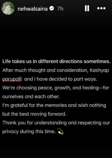 आयुष्य कधीकधी आपल्याला वेगळ्या दिशेने घेऊन जाते. खूप विचार केल्यानंतर पारुपल्ली कश्यप आणि मी वेगळे होण्याचा निर्णय घेतला आहे. आम्ही दोघंही स्वत:साठी आणि एकमेकांसाठी शांतता, प्रगती आणि विरामाचा मार्ग निवडत आहोत. या आठवणींसाठी मी नेहमीच कृतज्ञ आहे आणि पुढील वाटचालीसाठी शुभेच्छा देते, असं सायना नेहवालने पोस्टमध्ये म्हटलं आहे.