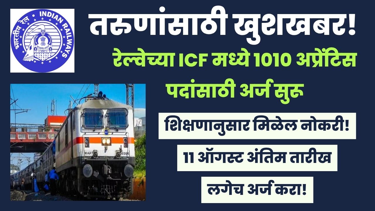 रेल्वे विभागात नोकरी करण्याचे स्वप्न पाहणाऱ्या तरुणांसाठी एक आनंदाची बातमी आहे. भारतीय रेल्वेच्या इंटिग्रल कोच फॅक्टरी (ICF) ने एकूण १०१० अप्रेंटिस पदांसाठी मेगा भरतीची अधिसूचना जाहीर केली आहे. सरकारी नोकरीच्या शोधात असणाऱ्यांसाठी ही एक मोठी संधी असून, अर्ज प्रक्रिया १२ जुलै २०२५ पासून सुरू झाली आहे. इच्छुक आणि पात्र उमेदवारांनी ११ ऑगस्ट २०२५ पूर्वी ऑनलाइन अर्ज करावेत.