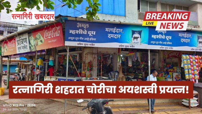 रत्नागिरी, २४ जुलै : रत्नागिरी शहरातील शिवाजीनगर परिसरात काल रात्री चोरट्यांनी एका दुकानाचे शटर उचकटून आत प्रवेश केला, मात्र त्यांच्या हाती मोठी रक्कम लागण्याऐवजी फक्त चिल्लरच (सुटे पैसे) मिळाली. या घटनेमुळे शहरात पुन्हा एकदा चोरट्यांनी डोके वर काढले आहे का, अशी भीती व्यक्त होत आहे.