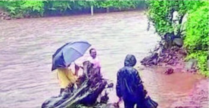 खेड : वडगाव बंधाऱ्याचे काम निकृष्ट झाल्याच्या तक्रारीनंतर महाराष्ट्र जीवन प्राधिकरणच्या अधिकाऱ्यांचे पथक बुधवारी पाहणीसाठी वडगाव येथे दाखल झाले. मात्र, मुसळधार पावसामुळे बंधारा संपूर्णपणे नदीपात्रात बुडालेला असताना, अशा स्थितीत नेमकी कोणती पाहणी करण्यात आली? असा सवाल ग्रामस्थ सचिन मोरे यांनी उपस्थित केला आहे.