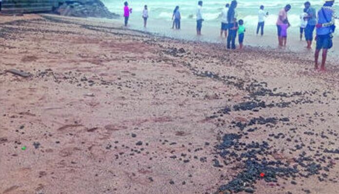 गणपतीपुळे : रत्नागिरी तालुक्यातील प्रसिद्ध तीर्थक्षेत्र असलेल्या गणपतीपुळे समुद्रकिनाऱ्यावर काळ्या डांबराचे साम्राज्य मोठ्या प्रमाणात दिसून येत आहे. समुद्रातून बाहेर पडणारे हे ऑईल मिश्रित काळे डांबर असल्याने हे डांबर समुद्रावर फेरफटका मारण्यासाठी उतरणाऱ्या पर्यटकांच्या पायाच्या तळव्यांना तसेच चपलांना चिकटत असल्याचे चित्र दिसून आले आहे.