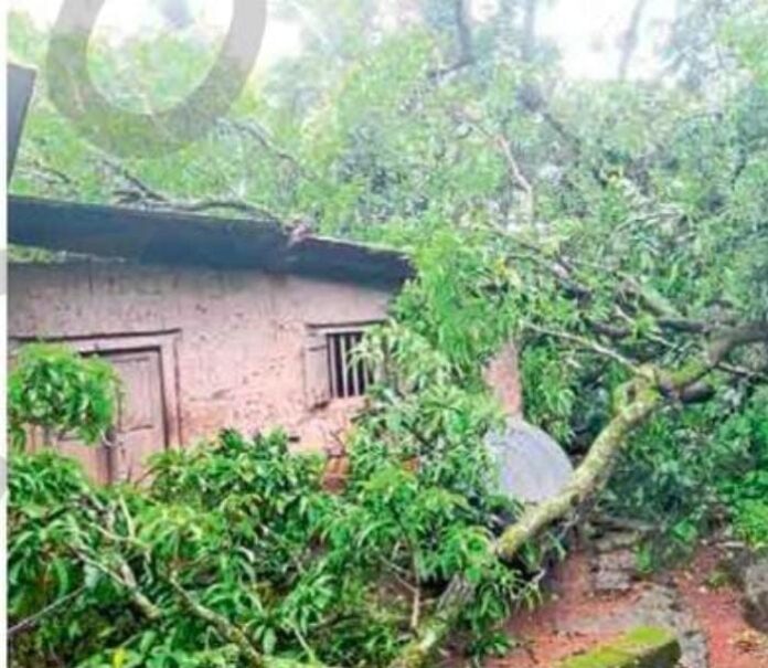 राजापूर : जिल्ह्यात पावसाचा जोर कमी झाला असला अधूनमधून श्रावणसरी कोसळतच आहेत. सलग चार दिवस वेगवान वाऱ्यासह जोरदार पाऊस पडत आहे. राजापूर तालुक्यात शिरसे येथील ग्रामस्थांच्या घरावर आंब्याचे झाड पडले. त्यामुळे घराच्या छपराचे नुकसान झाले आहे. तसेच एक महिला किरकोळ जखमी झाली आहे.