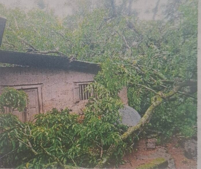 राजापूर : जिल्ह्यात पावसाचा जोर कमी झाला असला अधूनमधून श्रावणसरी कोसळतच आहेत. सलग चार दिवस वेगवान वाऱ्यासह जोरदार पाऊस पडत आहे. राजापूर तालुक्यात शिरसे येथील ग्रामस्थांच्या घरावर आंब्याचे झाड पडले. त्यामुळे घराच्या छपराचे नुकसान झाले आहे. तसेच एक महिला किरकोळ जखमी झाली आहे.