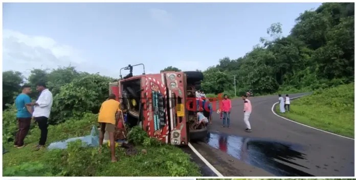 उक्षी मार्गावरील अवघड वळणावर फुणगूस येथे सोमवारी सकाळी ९ वाजण्याच्या सुमारास चालकाचा गाडीवरील ताबा सुटल्याने तो उजव्या बाजूला कलंडला. यामध्ये असलेले ४७बॅरलपैकी ३० बॅरल घटनास्थळी शिल्लक राहिले असून बाकीचा उतारातून घरंगळत गेले. यामध्ये मोठ्या प्रमाणात नुकसान झाले आहे. या बाबतची माहिती पोलिस पाटील यांनी संगमेश्वर पोलिस ठाण्याला दिली असून पोलिस घटनास्थळी पोहचून पंचनामा केला आहे.