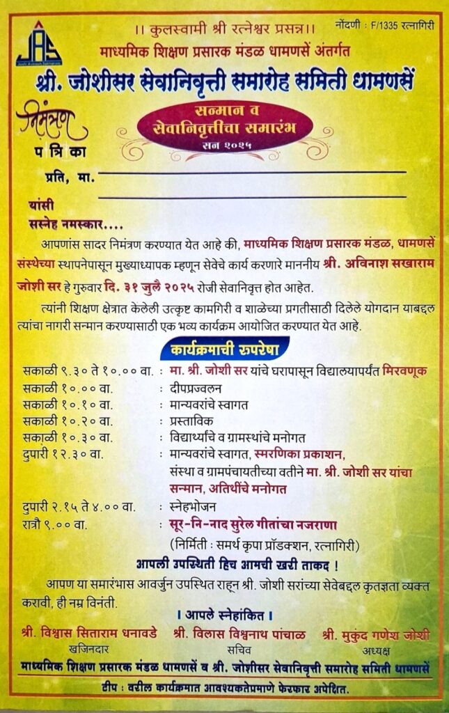 माध्यमिक शिक्षण प्रसारक मंडळ धामणसे संचलित, माध्यमिक विद्यालय धामणसे (ता. जि. रत्नागिरी) प्रशालेचे मुख्याध्यापक श्री. अविनाश सखाराम जोशी हे आज ३१ जुलै २०२५ रोजी सेवानिवृत्त होत आहेत. त्यांच्या कार्याविषयी थोडक्यात..