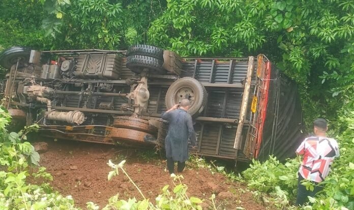 संगमेश्वर : संगमेश्वर तालुक्यातील फुणगुस येथील अवघड वळणावर पुन्हा त्याच ठिकाणी सकाळी 10 वाजता दुसरा अपघात झाला आहे. गोव्याहून वसईकडे जाताना गुगल मॅपद्वारे फुणगुस मार्गे हा ट्रक चालला होता. फुणगुस येथील अवघड वळणार गाडीवरील ताबा सुटल्याने अपघात झाला. सुदैवाने चालकाने गाडीतून उडी मारल्यामुळे जीवितहानी टळली. दोन दिवसापूर्वी याच ठिकाणी केमिकल टँकरचा अपघात झाला होता. 15 दिवसातील हा तिसरा अपघात आहे. वारंवार घडणाऱ्या या अपघाताने ग्रामस्थ भयभीत झाले आहेत.