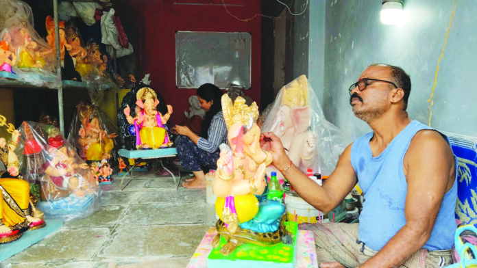 जिल्ह्यात अनेक चित्रशाळांमध्ये पीओपीच्या मूर्ती आणल्या जातात. यावर्षीही शाडूच्या मूर्तीला पीओपीची जोडः मात्र केवळ शाडूमातीच्या मूर्ती तयार करणाऱ्या मूर्तिकारांचे काम पूर्णत्वाकडे जात आहे. दिवस-रात्र काम केल्यामुळे सध्या रंगकामाची लगबग चित्रशाळांमध्ये दिसत आहे- मूर्तिकार चिन्मय पांचाळ, कैवल्य चित्रशाळा साईनगर-रत्नागिरी