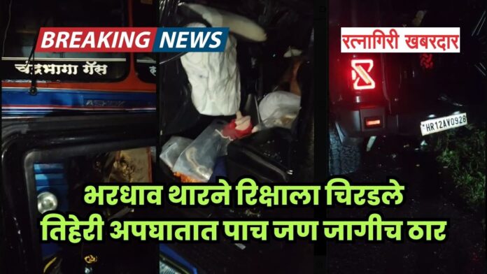 चिपळूण, १९ ऑगस्ट : चिपळूण-कराड महामार्गावर वैशिष्टी डेरीजवळ पिंपळी कॅनॉल येथे काल रात्री १० ते ११ च्या सुमारास एक मन हेलावून टाकणारी घटना घडली. कौटुंबिक वादातून भरधाव वेगात असलेल्या थार गाडीने एका रिक्षाला मागून धडक दिल्याने झालेल्या भीषण तिहेरी अपघातात पाच जणांचा जागीच मृत्यू झाला आहे. मृतांमध्ये रिक्षामधील चार प्रवासी आणि थार चालकाचा समावेश आहे.