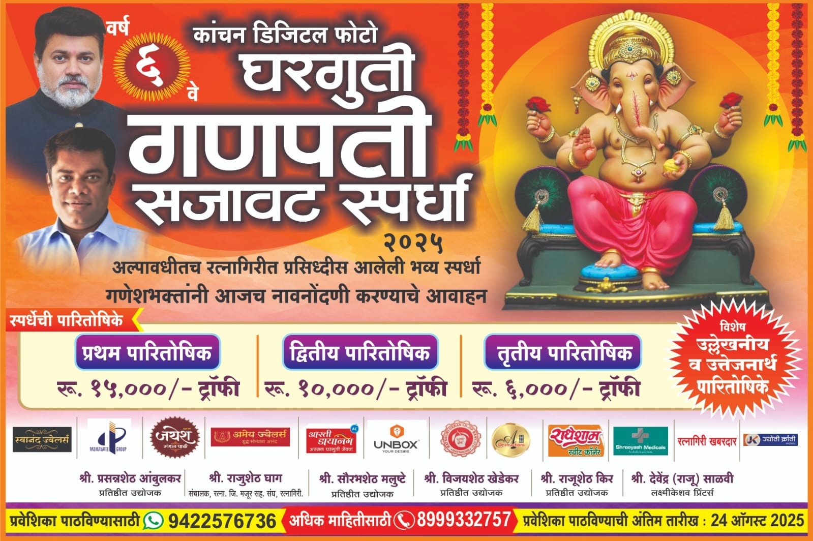 रत्नागिरीतील सुप्रसिद्ध फोटोग्राफर कांचन मालगुंडकर यांच्या ‘कांचन डिजिटल’ तर्फे आयोजित केल्या जाणाऱ्या आणि अल्पावधित अत्यंत लोकप्रिय ठरलेल्या ‘घरगुती गणपती सजावट स्पर्धे’च्या सहाव्या पर्वाची घोषणा आज अंगारकी संकष्टीच्या शुभ मुहूर्तावर करण्यात आली. यंदा स्पर्धेतील बक्षिसांच्या रकमेत वाढ करण्यात आली असून, गणेश मूर्तिकारांना प्रोत्साहन देण्यासाठी एका विशेष पुरस्काराचीही घोषणा करण्यात आली आहे, ज्यामुळे गणेशभक्तांमध्ये उत्साहाचे वातावरण आहे.
