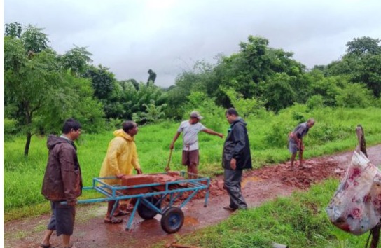 चिपळूण : संगमेश्वर तालुक्यातील नजिकच्या ग्रामपंचायत कोसुंबमधील अंतर्गत फुगीचीवाडी ते फेपडेवाडी या रस्त्यावरील खड्डे फेपडेवाडीतील श्री देवी पडळकरीन मित्र मंडळातील ग्रामस्थांनी जांभा दगडाचे डबर वापरून भरले तसेच फुगीचीवाडी ते फेपडेवाडी ते रेवाळेवाडी या रस्त्याच्या बाजूस असणारी झाडी व गवत सफाई ग्रामस्थांनी श्रमदान करून केली आहे.