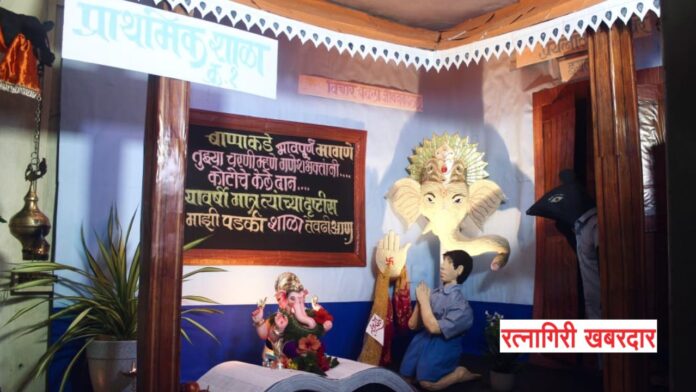 रत्नागिरी: एका बाजूला गणेशोत्सवाचा जल्लोष आणि दुसरीकडे सामाजिक वास्तवाचे भान… याचा अनोखा संगम रत्नागिरीतील एका गणेश देखाव्यातून पाहायला मिळत आहे. शहराजवळील उत्कर्ष नगर येथील रहिवासी संजय वर्तक आणि त्यांच्या कुटुंबीयांनी सलग १७ व्या वर्षी पूर्णतः पर्यावरणपूरक गणेशमूर्ती साकारली असून, यावर्षी शासकीय शाळांच्या दुरवस्थेवर अत्यंत मार्मिक देखावा सादर केला आहे. ‘गणपतीच्या चरणी कोटींचे दान करणाऱ्या भाविकांनी शाळांच्या दुरुस्तीसाठी दान करावे,’ असे थेट आवाहन या देखाव्याच्या माध्यमातून करण्यात आले आहे.