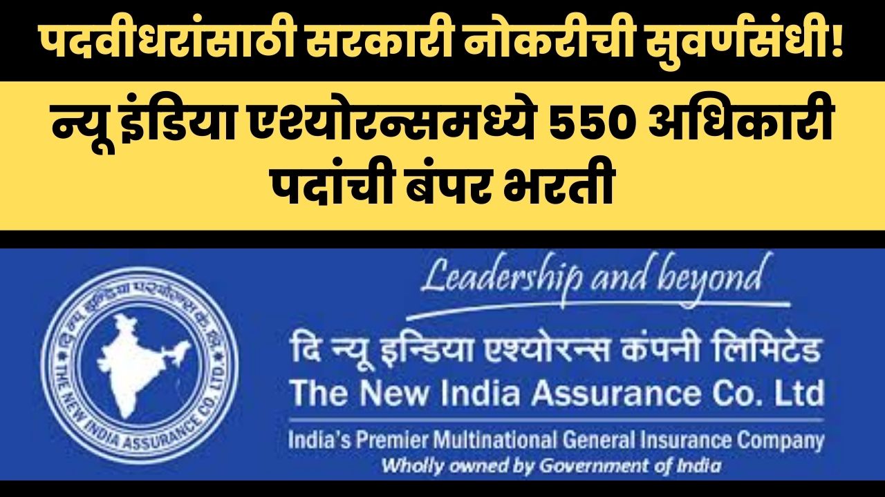 मुंबई: सरकारी नोकरीच्या शोधात असलेल्या तरुण-तरुणींसाठी एक मोठी संधी चालून आली आहे. भारत सरकारचा उपक्रम असलेल्या ‘न्यू इंडिया एश्योरन्स कंपनी लिमिटेड’ (NIACL) मध्ये तब्बल ५५० प्रशासकीय अधिकारी (ॲडमिनिस्ट्रेटिव्ह ऑफिसर्स – स्केल I) पदांसाठी भरती प्रक्रिया सुरू झाली आहे. विशेष म्हणजे, अर्ज करण्यासाठी आता केवळ दोनच दिवस शिल्लक राहिले आहेत.
