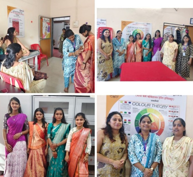 सारी ड्रेपिंग कार्यशाळेमध्ये लागणाऱ्या मॉडेल्स ब्युटी अँड वेलनेस डिपार्टमेंटच्या विद्यार्थिनींनी सुद्धा सहभाग घेतला होता. यामध्ये सहावारी साडी, ब्राह्मणी साडी, नऊवारी साडी, सहावारीपासून नऊवारी साडी, साडीचा वापर करून घागरा कशाप्रकारे नेसायचा, गुजराती पॅटर्न साडी कशाप्रकारे नेसायचे याचे प्रशिक्षण घेण्यात आले. ही कार्यशाळा सौ. सिद्धी सावंत यांच्या हस्ते पार पाडण्यात आली. अतिशय उत्साही आणि आनंदी वातावरणामध्ये ही कार्यशाळा संपन्न झाली.