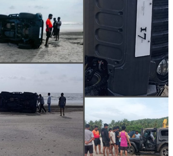 दापोली : तालुक्यातील प्रसिद्ध कर्दे समुद्रकिनारी पुन्हा एकदा पर्यटकांच्या बेफाम कृत्याचा थरार समोर आला आहे. काल संध्याकाळी साडेचारच्या सुमारास समुद्रकिनारी भरधाव वेगाने थार गाडी चालविण्याचा प्रकार घडला. गाडीचालकाचा ताबा सुटल्याने थार गाडी अचानक उलटली आणि या प्रकाराची संपूर्ण दृश्ये सीसीटीव्ही कॅमेऱ्यात स्पष्टपणे कैद झाली आहेत. गुरुवार 11 सप्टेंबर रोजी सायंकाळी 4.30 वाजण्याच्या सुमारास अपघात घडला.
