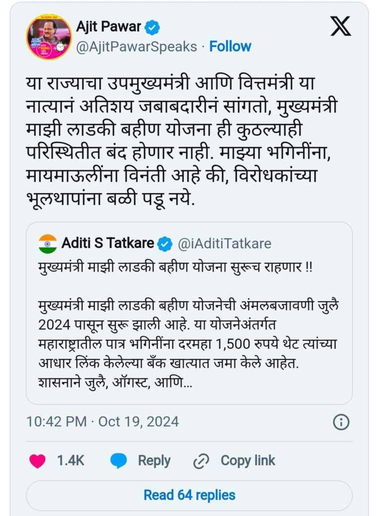 “मुख्यमंत्री माझी लाडकी बहीण योजना सुरूच राहणार !! मुख्यमंत्री माझी लाडकी बहीण योजनेची अंमलबजावणी जुलै 2024 पासून सुरू झाली आहे. या योजनेअंतर्गत महाराष्ट्रातील पात्र भगिनींना दरमहा 1,500 रुपये थेट त्यांच्या आधार लिंक केलेल्या बँक खात्यात जमा केले आहेत”, असे अदिती तटकरेंनी म्हटलं आहे.