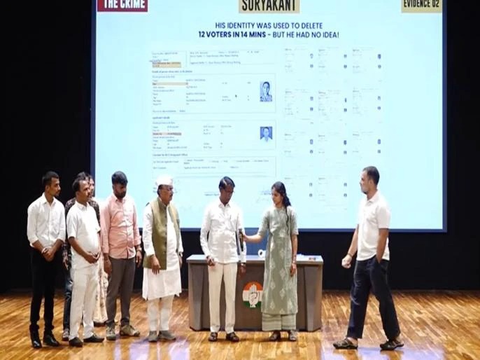 राहुल गांधी पत्रकार परिषदेत म्हणाले की, भारताचे केंद्रीय निवडणूक आयुक्त ज्ञानेश कुमार लोकशाही उद्ध्वस्त करणाऱ्या यंत्रणेला मदत करत आहेत. मी लोकसभेचा विरोधी पक्षनेता म्हणून ही जबाबदारीने माहिती शेअर करत आहे. आम्ही पुराव्यासह या गोष्टी मांडत आहोत. १००० टक्के आम्ही सर्व पडताळणी करून या गोष्टी समोर आणत आहोत. भारताची लोकशाही वाचवणं हे आमचे कर्तव्य आहे. कर्नाटकातील आळंद मतदारसंघात ६०८० मतदारांची नावे वगळण्यात आली. कुणीतरी जाणुनबुजून हे करत होते. पूर्ण निवडणूक प्रक्रिया हायजॅक करण्यात आली असा आरोप करत राहुल गांधी यांनी वगळण्यात आलेल्या मतदारांनाच स्टेजवर आणले.