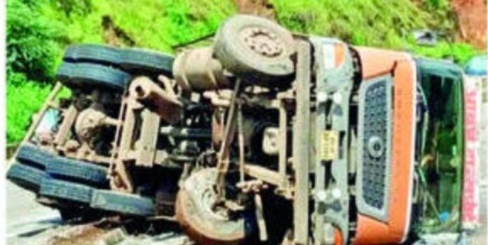 चिपळूण : मुंबई-गोवा महामार्गावरील कामथे घाटात काल बुधवारी सिमेंट भरलेला ट्रॅक उलटला. सकाळी सुमारे ११.४५ वाजता हा अपघात झाला. त्यात चालक किरकोळ जखमी झाला. त्याला उपचारासाठी जवळच्या खासगी रुग्णालयात दाखल करण्यात आले आहे. अपघातात ट्रकचे मोठे नुकसान झाले महामार्गावर सिमेंटच्या बॅगांची पडल्या. चालकाचे नाव साखम मुद्रीत खान (३०, रा. राजस्थान) असे असून तो बदलापूरकडे सिमेंट घेऊन जात होता.
