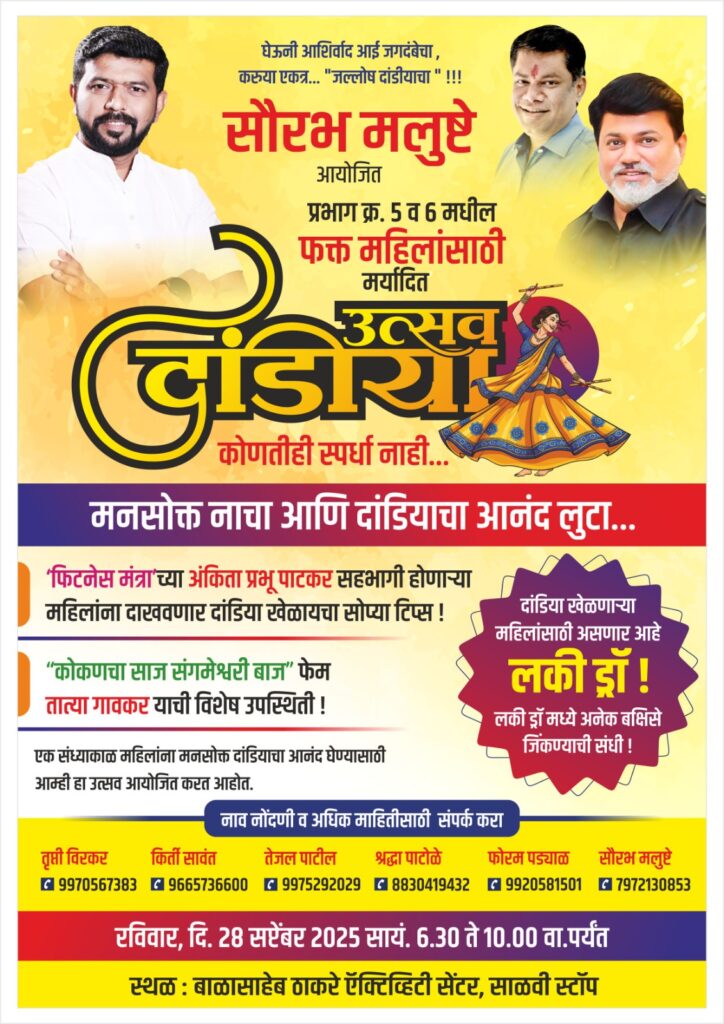 यावेळी केवळ दांडिया खेळण्याचाच नव्हे, तर बक्षिसे जिंकण्याचाही आनंद देखील महिलांना मिळणार आहे. कार्यक्रमात सहभागी होणाऱ्या महिलांसाठी खास लकी ड्रॉ स्पर्धा आयोजित करण्यात आली असून, विजेत्यांना आकर्षक बक्षिसे दिली जाणार आहेत. यामुळे या ठिकाणी दांडिया खेळण्याचा आनंद लुटताना प्रभागातील महिलांना बक्षिसांची देखील लयलूट करता येणार आहे. आयोजक सौरभ मलुष्टे यांनी प्रभाग ५ आणि ६ मधील सर्व महिलांना या विशेष कार्यक्रमात सहभागी होण्याचे आणि दांडियाचा मनसोक्त आनंद लुटण्याचे आवाहन केले आहे. हा कार्यक्रम महिलांना एकत्र येऊन आनंद साजरा करण्याची एक उत्तम संधी देणारा असून या कार्यक्रमात अधिकाधिक महिलांनी सहभाग घ्यावा असे आवाहन करण्यात आले आहे. या कार्यक्रमात सहभागी होण्यासाठी तृप्ती वीरकर 9970567383, कीर्ती सावंत 9665736600, तेजस पाटील 9975292029, श्रद्धा पाटोळे 8830419432, फोरम पड्याळ 9920581501, सौरभ मलुष्टे 7972130853 या क्रमांकावर संपर्क करावा असे आवाहन करण्यात आले आहे.